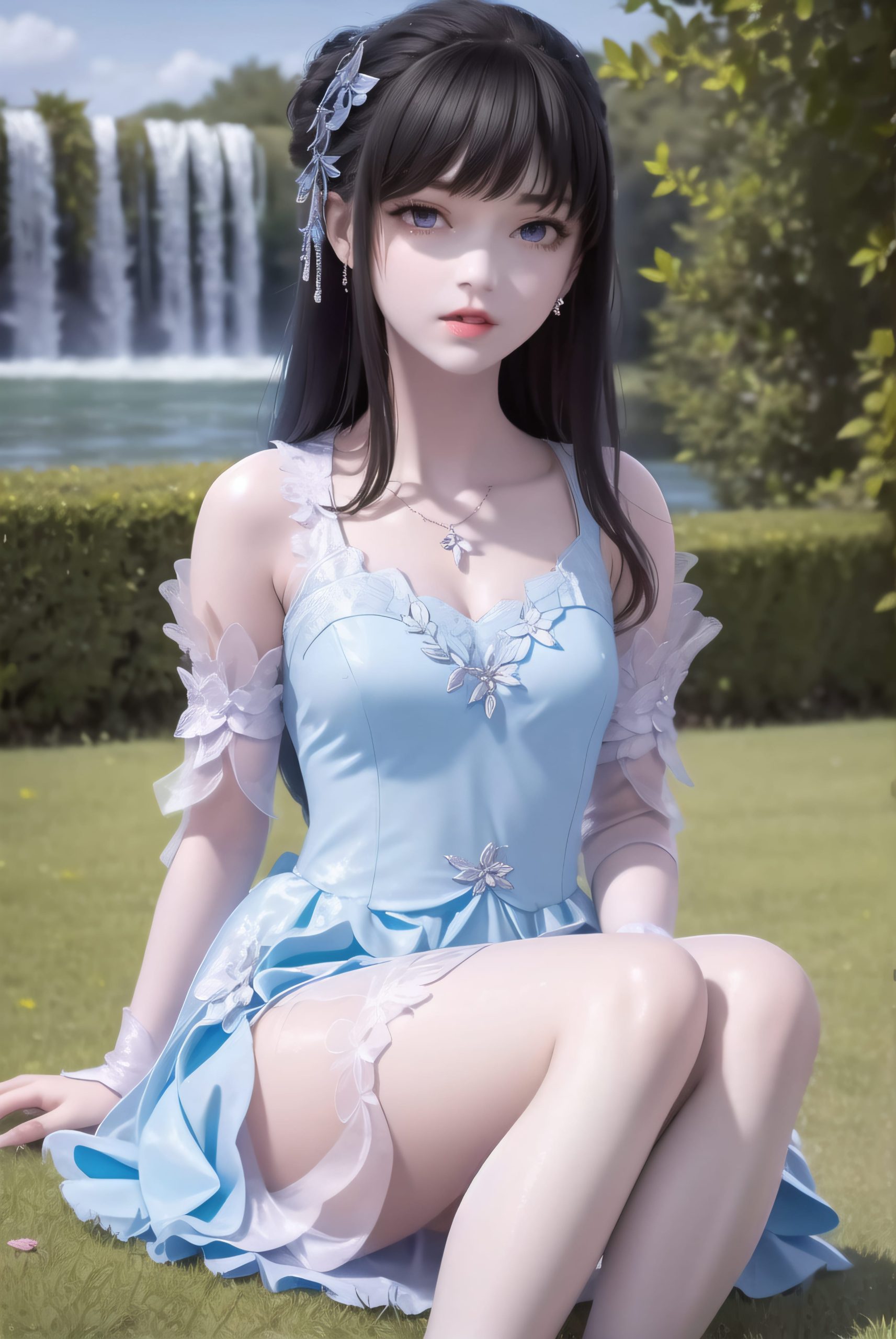 她的长发如瀑布般垂至腰间,色泽如同夜空中最深沉的墨色,闪烁着幽暗的光泽。她的皮肤白皙如玉,光滑细腻,仿佛能透出淡淡的光晕。